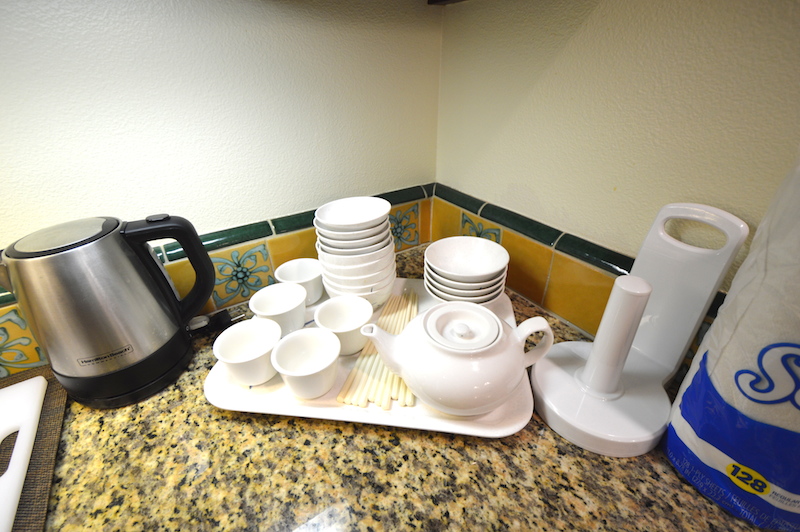 今回ご紹介しているマリオットのコオリナ2LDK物件ですが、1LDKや3LDKと同じで、フルキッチンが備わっています。オーブン、コーヒーメーカー、湯沸かし器、そして冷蔵庫など揃っているので、自宅にいるように料理をすることが出来ます。調理器具や食器も一通り揃っているので、安心です。調味料などは日本から持ってくるのがおすすめですが、食材は近くのセーフウェイかコストコがおすすめです。キッチンでおかずや主食を用意して、バーベキューエリアでお肉を焼いてアメリカンなディナーもいいですね。食洗機もありますので、使い慣れない方もいらっしゃるかもしれませんが、とても便利なのでハワイ旅行中は是非活用してゆっくり過ごしたいですね。また、キッチンの大きな収納(2枚の扉の後ろ)には洗濯機と乾燥機があります。お洗濯もお部屋の中で完結するので、便利で快適な滞在ができます。