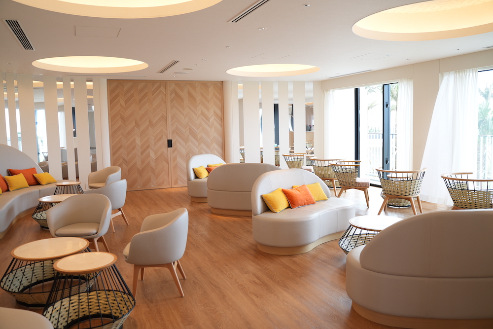 「ザ・ビーチリゾート瀬底」(タイムシェア)のラウンジは明るく広々とした空間で、ソファ席とラウンジチェア席の2種類が用意されています。また、同じ空間にドリンクなどをセルフサービスでいただけるサービスデスクとすぐ隣にはリゾートのスタッフさん用のラウンジデスクがあります。